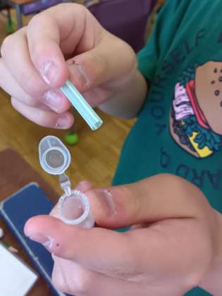 でんぷんがあるかどうか確かめる試薬の名前を覚えていますか。答えは、「ヨウ素液」。懐かしい感じ。見事なシェイクで、うまくでんぷんが分解されているといいのですが。