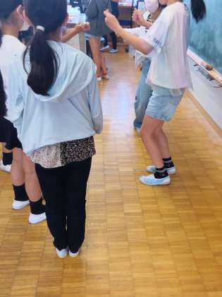 これは、「消化」についての学習をしているところです。口に入った食べ物が、唾液のはたらきにより分解されることを確かめる実験です。米粒を溶かした水(でんぷん)に唾液を入れ、唾液のはたらきででんぷんが分解される様子を確かめます。容器に入れて、しっかり混ぜるために振るんですが、ここで「運動会の熱気、再び」です。運動会のダンスでシェイク!シェイク!膝を曲げる感じは、5年生の「Bling-Bang-Bang-Born」でしょうか。