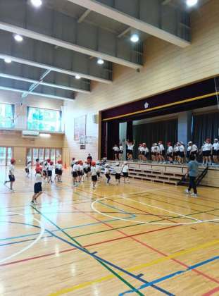 そして、同日の体育館。1年生の体力テスト20mシャトルランを終えた6年生が舞台上で1年生に運動会のダンスを披露していました。1年生もノリノリで喜んでいて、こちらも「運動会の熱気、再び」となりました。