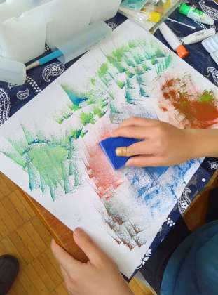 スポンジを使って、絵を描いていきます。何かを描く「絵」になっていてもいいし、「模様」でもOK。形も色も自分で決めて、自由に描いていきます。一つの色で描く子もいれば、多色で描いていく子もいます。スポンジをつぶして、太い筆のようにして描いている子もいました。