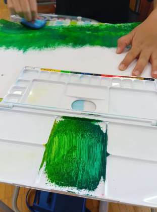 模様のように、なにも考えずに描いていったものが、「何か」に見えてきて、途中から絵を描いていった子もいました。絵具を広げるパレットの中も芸術的な色や模様になっています。