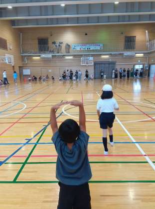 5年生が、2年生の体力テスト「20mシャトルラン」の計測のお手伝いをしていました。