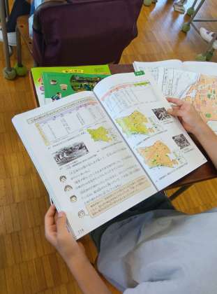 土地の使われ方についてや世田谷区の交通の様子について、資料や地図を使って学習をしています。今日は、交通の話をしている中で、