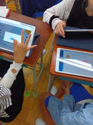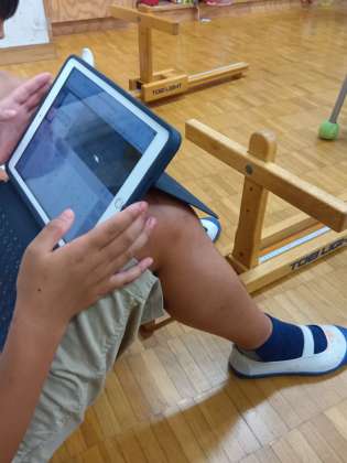 さて、5年生は記録の入力も全て自分たちで行うため、タブレット端末とともに動きながら計測をしています。長座体前屈の計測器の準備をして、タブレット端末を開いている様子が未来の乗り物に見えてかっこいいと思ってしまいました。宇宙戦争ものに出てきそうです。