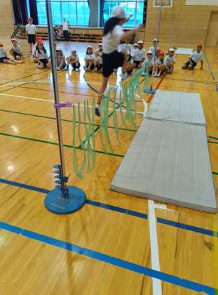 走り高跳びというと、華麗な背面跳びが思い浮かぶかもしれませんが、小学校では「はさみ跳び」を行います。
