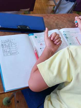 でも、棒グラフはいきなり描けません。まず棒グラフに表す数値が必要なので、まずデータを表にまとめます。「正」の字で数えながら、グラフに表すデータの数値が得られる表にします。タブレット端末に色を付けてカウントしている子もいました。2度数えたりして間違いが起こらないように、確実に数えるのが大切です。