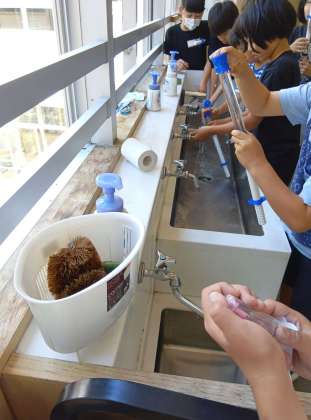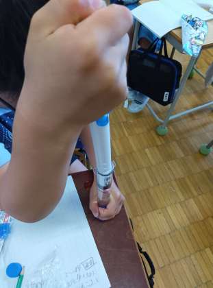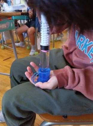 少し前に、中に空気を入れて実験をしていました。更に中にはスポンジの人形が入っています。空気は、押すと少しピストンが進みます。空気をぎゅっと潰すことで、中の人形もぎゅっと潰されたようになっていました。ここから、「空気は、押し縮めることができる。」と言うことができます。