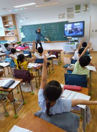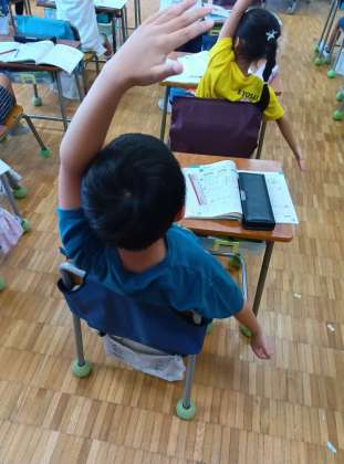 体操をしているように見える2年生ですが、算数の真っ最中です。体を使って、「>(大なり)」「<(小なり)」を表現しています。ちょっと楽しくなりますね。