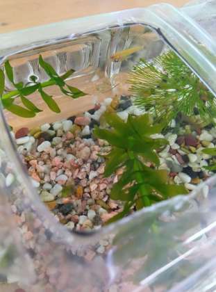 水槽で飼うと、病気が一気広がってしまったり、なかなか繁殖ができなかったりすることがあります。水質の管理も難しい。一方このペットボトルハウスは、メダカをペアで育てるのはちょうどよく、水草を入れて、餌をやりすぎないようにすれば水質も保てますし、水替えは端の蓋の部分からもできて簡単です。