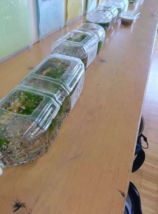 少し前に、理科でメダカを住み替えさせる計画を立てていた5年生、すでにリハウスが済んだようで、教室の後ろには、ペットボトルハウスがずらりと並んでいました。