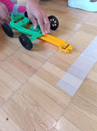 3年生が車を走らせています。発射(発車)台がついている車です。どうやらゴムを伸ばして、それが戻る時の力で車を発射(発車)させるようです。