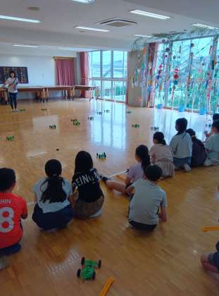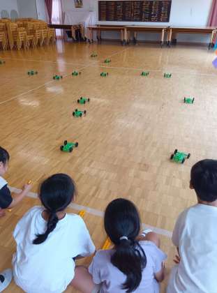 これは理科の学習で「ゴムと風の力」の学習です。ゴムの太さを変えたり、引っ張る長さを変えたりして、車が進む距離を比べていました。競争ではなく、実験なので静かに進んでいきます。それにしても、車を使った実験は楽しいです。多分1年生から6年生まで、どの学年も好きだと思います。