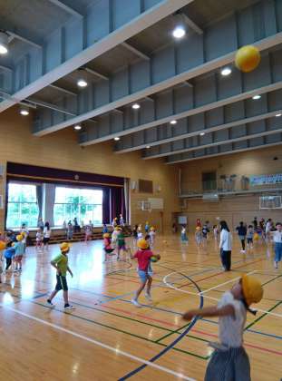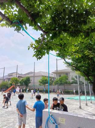 中休み、今日も元気に外遊びです。ちょっとその前に、ミストを浴びて・・・