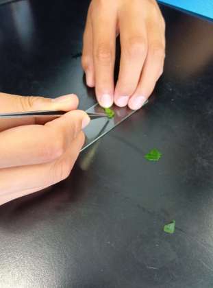 そのまま見てもただ葉の表面が大きく映るだけです。少し薄くなるようにそぎ落として、プレバラートを作っていました。