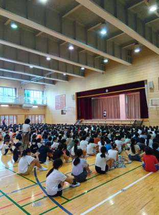 今朝は児童集会で、集会委員会が間違い探しゲームをしています。全校で集まっても体育館は涼しいです。