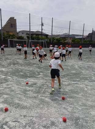 玉入れの玉を使った鬼ごっこをしています。鬼の守りをかいくぐって、玉を取ってくるルールのようです。