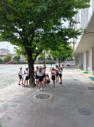 1時間目なので、まだそこまで気温は上がっていませんでしたが、時々休憩を入れて水分補給をしながら進めています。休憩に入った子が言いました。