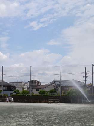 中休み後、校庭ではスプリンクラーで水まきです。忘れ物をした6年生がスプリンクラーから逃げていました。