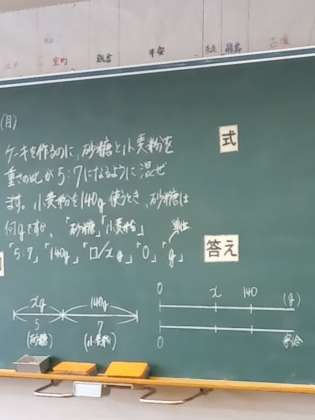 黒板の線分図の右の方が見えるでしょうか。見える方は挑戦してみてください。砂糖と小麦粉を5:7の比で混ぜケーキを作ります。小麦粉が140gのとき、砂糖は・・・という場面を線分図に表しています。右の線分図で、「x」と「140」の下に入る割合の数字は・・・
