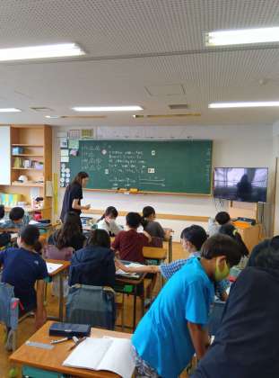 算数で「比」の学習をしている6年生。難しい問題について知恵を出し合っていました。
