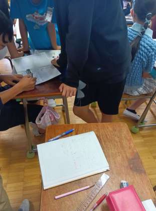 初め子どもたちも迷っていたんですが、「あっ」とか「んっ」とかひらめく子が出てきて、解決していきました。写真は、その子たちが一生懸命相手に伝わるように説明をしているところです。