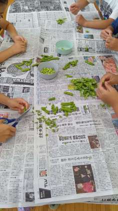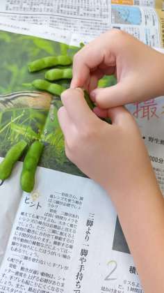 生の枝豆をさやから出します。枝豆というと、塩ゆでしたものにお目にかかることが多く、指でぎゅっと押すとぽんと飛び出しそうなイメージがありますが、「生」の枝豆は硬いです。とても硬いです。指で押しても出てはきません。端をはさみで切って、さやを丁寧にむいていきます。教室は、生の植物を切ったときのにおいがしています。