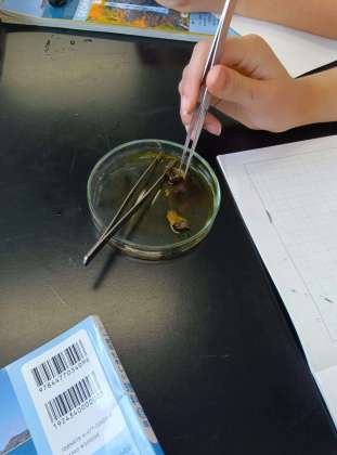 5年生が、発芽や成長の秘密を探ってきたインゲン豆の種子を詳しく調べていました。