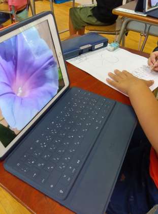 朝顔の観察などでは、その場で見ることもしますが、暑いので写真に撮って教室で絵を描くことが多いです。拡大すると花の細かいところ、おしべやめしべなどもはっきり見ることができます。便利です。