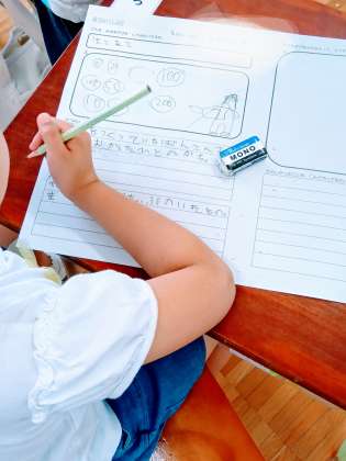 真ん中の写真は、生活科「なつといっしょに」で、今度は水遊びを計画しているところです。左側に「どんな水あそびをしたいか」を絵と言葉で書いて計画を立てています。左側は、活動をした後のふり返りです。今度は、どんな気づきがあるでしょう。楽しみです。