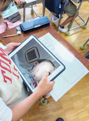 先日自分が書いたプリントを撮って送ろうとしたときに、カメラを起動したら自分の顔が映って困っている子がいました。「このボタンですよ。」と教えてあげると、無事撮りたいものの方が写って安心していました。
