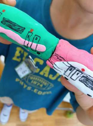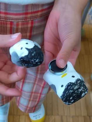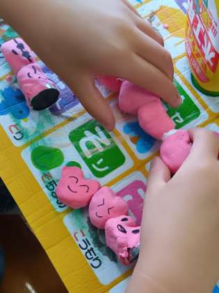 でき上がったマスコットを子どもたちが見せてくれます。左は、夢のコラボレーション!新幹線「こまち」と「はやぶさ(?違ったらごめんなさい。覚えられなかった!)」絶対にないドッキングです。前に見たときにハートをたくさん作っている子がいたのは、どうなるんだろうと思っていたら、なるほど、いくつかくっつけたハート同士をマグネットで「くっつき」にするのが分かりました。右は、前回の真ん中に載っていた写真の作品ですが、何になるのかあの時点では分かりませんでしたが、かわいいペンギンの親子になっていました。親ペンギンのおなかに子ペンギンがくっつくようです。