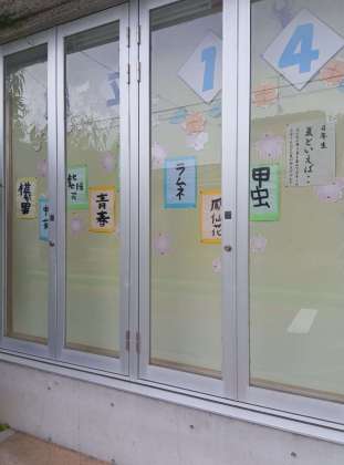 正門脇の掲示板には、4年生が書いた「夏といえば・・・」の毛筆作品が飾ってあります。