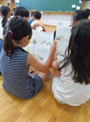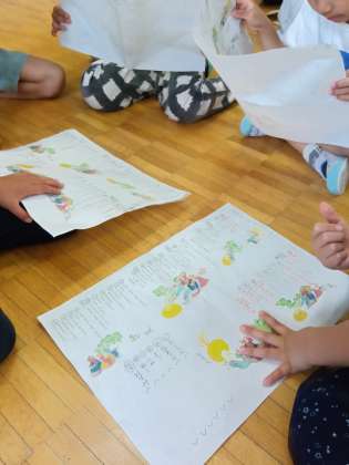 全文が1枚にまとめられたシートを持ち、グループで集まって相談しています。だれがどこを読むのか、どんな風に読むのか、相談しているようです。