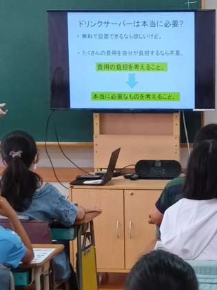 授業の中では、税金について理解するために、「学校にドリンクサーバーを導入すること」を例にとって、考えていました。