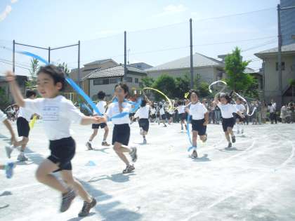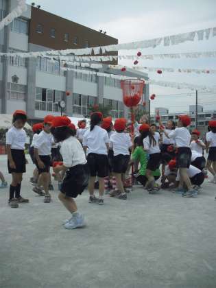1年生は恒例の「玉入れ」です。表現は「みんなあつまれ!レインボー」です。布を使った演技です。長い布をくるくる楯に回したり横に回したり楽しく演技しました。1年生は小さな動き、しぐさがとてもかわいいです。布は練習でボロボロになり、本番では新しく作り直したのです。(校長 箭内)