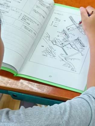 宿の館内案内図を見て、「ここが部屋で」とか「ここを通って食事に行って」「ここに集まって」といった感じにシミュレーションをしています。図だけだとなかなかイメージできないと思いますが、現地に着くと今やっていることがピッとつながると思います。出発を楽しみに、これから準備を進めていきましょう。