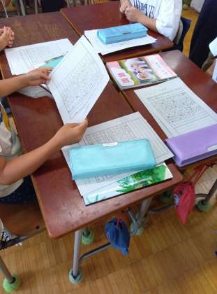国語の説明文「こまを楽しむ」で見付けた自分の「推し」のこまを発表し、質問に答えたり、コメントをしたりして友達と関わります。聞いた子は、自分の考えと相手の考えを比べ、よいところを伝えていました。何度かグループを変えて取り組みます。