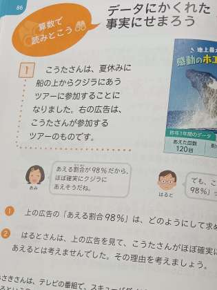ある広告に示されたデータの真実に迫る・・・6年生の算数です。そこには、「算数で読みとこう」と書かれています。算数「を」読みとくのではなく、算数「で」読みとくのです。
