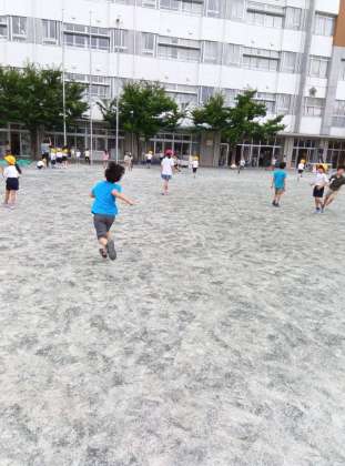 昨夜の雨で久しぶりに気温が下がり、少し過ごしやすい朝でした。中休みも引き続きそこまで気温は上がっていません。放送で「蒸し暑いので水分補給を」の注意があり、元気に子どもたちが外に出てきました。