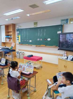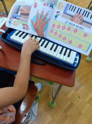 1年生の音楽の鍵盤ハーモニカ、指の位置や指使いを守って、正しく丁寧に演奏していました。基本が大切です。繰り返しの練習の成果で、初めてまだ何か月かですが随分上達しました。