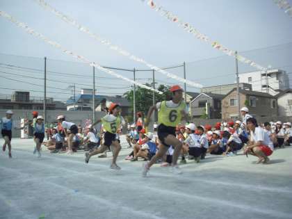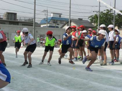 運動会の花形種目のリレーです。花形ですから演技の順番は最後の種目となります。走る方はもちろん、応援する方も気合が入ります。おもわず前のめりになって応援しています。リレーの結果によって勝負が逆転することもあります。