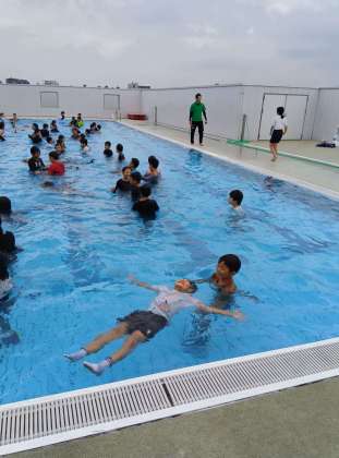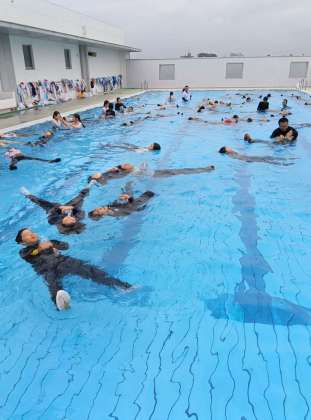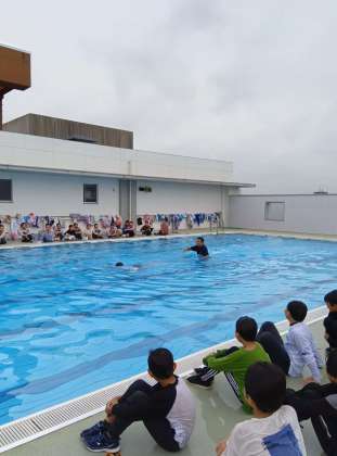 途中、先生たちによるデモンストレーションがありました。おぼれている人を助けようとしています。これも危険です。おぼれている人は気が動転していますし、強い力で掴んできて、助けに入った人もおぼれてしまう危険があります。これは大人でも同じです。そこで今回おぼれている人に少しでも浮くものを渡すということで、ペットボトルを用意してきてもらいました。それをおぼれている人の近くに投げます。ただ空のペットボトルは軽すぎて飛ばなかったり、風に流されて思うところにはいきません。そこで、少しだけ水を入れ投げる練習をしました。そして、ペットボトルを使って、浮く練習をしました。ペットボトルをお腹や胸のあたりに引き付けて抱くように持ち、先ほどと同じように仰向けで水に浮きます。ペットボトルの浮力で先ほどよりも楽に浮くことができ、長い時間浮いたままでいることができました。