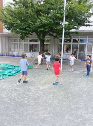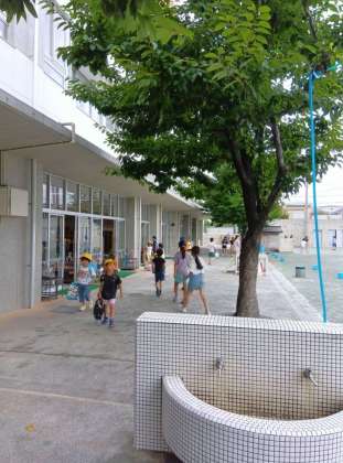 おや、校庭にはバケツに組まれた水が点々と、大きなポリバケツにためた水も・・・たのしいことが起こりそうです。