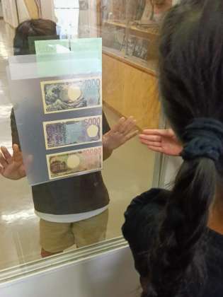 先日、金融機関に行く用事があって出かけた際に、新紙幣に交換可能ということだったので、子どもたちに見てもらおうと1種類ずつ交換してもらってきて、先週から校長室の前で見られるようにしています。