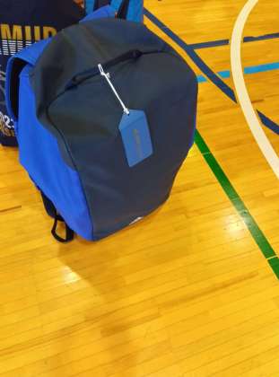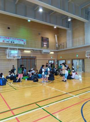 今日から6年生が日光林間学園に出かけます。集合時刻が近付き、子どもたちが大きな荷物を抱えて続々と集まってきました。