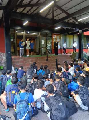 1日目の予定を終え、ほぼ予定どおりにホテルに到着しました。開園式を行います。児童代表の言葉に続き、ホテルの方からのお話を聞きます。これから3日間お世話になります。ご挨拶をしてホテルに入ります。