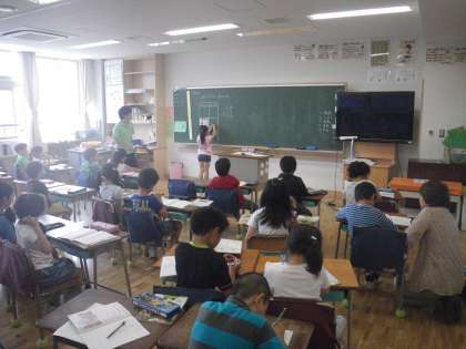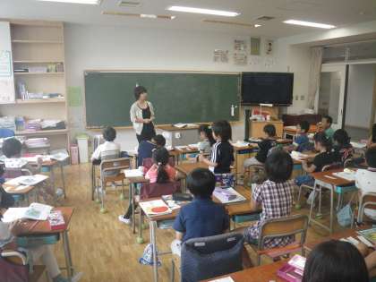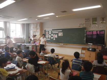 4日の3校時、2年生3クラスをまわってみました。1組は国語「なかまのことば」の学習でした。2組は算数「38∔27の計算のやり方」の勉強でした。3組は食育「よくかんで食べよう」の勉強でした。担任と一緒に栄養士の矢後先生が指導していました。食育「よくかんで食べよう」は2年生の3クラスで順番にやりました。