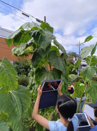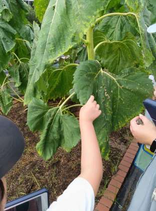 夏の暑い時期に大きく育ったひまわりは頭が重たくてだらりと頭を垂れています。ちょうど子どもたちを見下ろすような恰好でした。葉っぱも大きくなっています。触ってみるとざらざらとした感触がして驚いています。