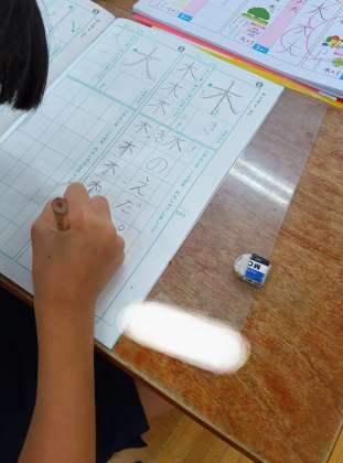 ドリルや漢字ノートの使い方を教わっていよいよ漢字の学習が始まりました。教科書によりますが、初めに学習するのが「木」のようです。平仮名、片仮名の学習のときのように、丁寧になぞって練習をします。