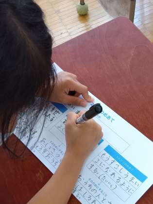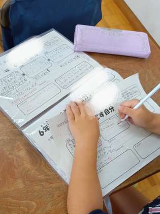 2年生が、2学期の目標カードを書いていました。「学しゅう」「生かつ」「うんどう」についてそれぞれめあてを決め、それぞれに「目標を達成するためにどうするか」が書かれています。